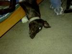 Hey, that's a new position. Haven't seen that one yet. L'il Bullet has mastered the cockroach, and is now "tent sleeping" as well as making himself a "bumper" and "headboard" around his crate. Murphy won't cockroach at all. He doesn't find it dignified. He either sleeps in the "anchor" or on his side.