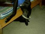 Hey, that's a new position. Haven't seen that one yet. L'il Bullet has mastered the cockroach, and is now "tent sleeping" as well as making himself a "bumper" and "headboard" around his crate. Murphy won't cockroach at all. He doesn't find it dignified. He either sleeps in the "anchor" or on his side.